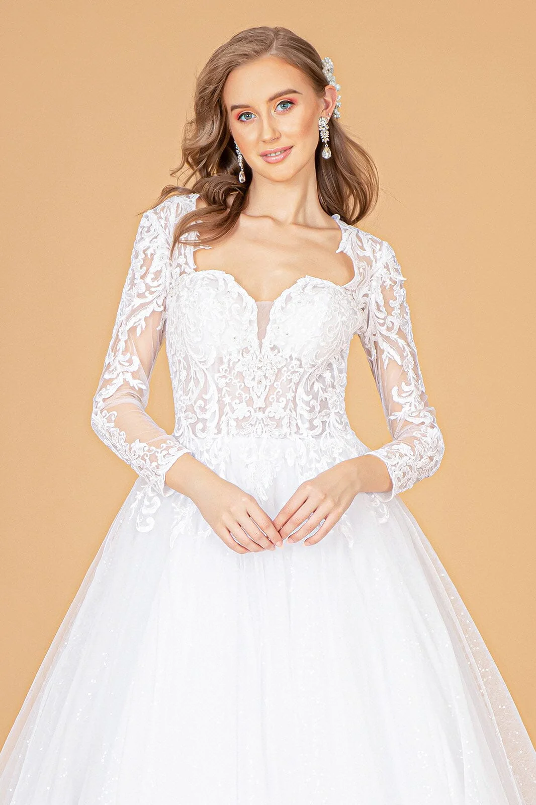 All eyes will be on you in this embroidered long-sleeved wedding dress with A-line skirt by Elizabeth K GL1804. This airy soft mesh layered wedding gown features illusion sweetheart neckline and beautifully embroidered bodice decorated with jewels and beads. The sheer bodice with long sleeves creates an elegant effect, and the cut-out back gives you ultra-feminine and bold look as well.