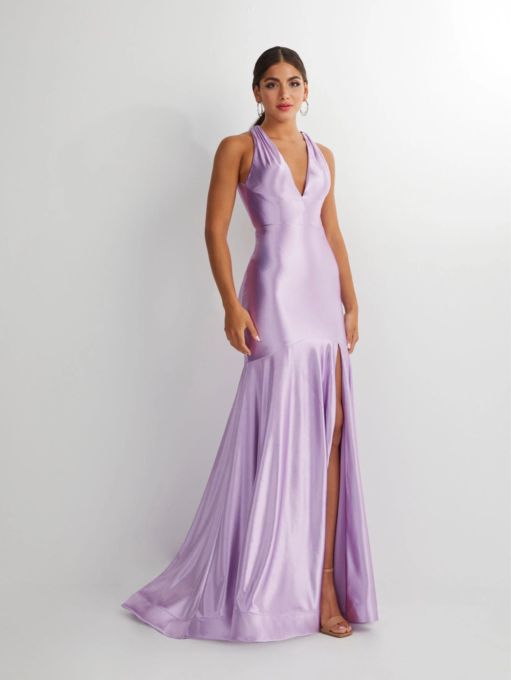 V-neck tank fit and flare dress with ruching details, slit side front, open cross strap back and sweep train.