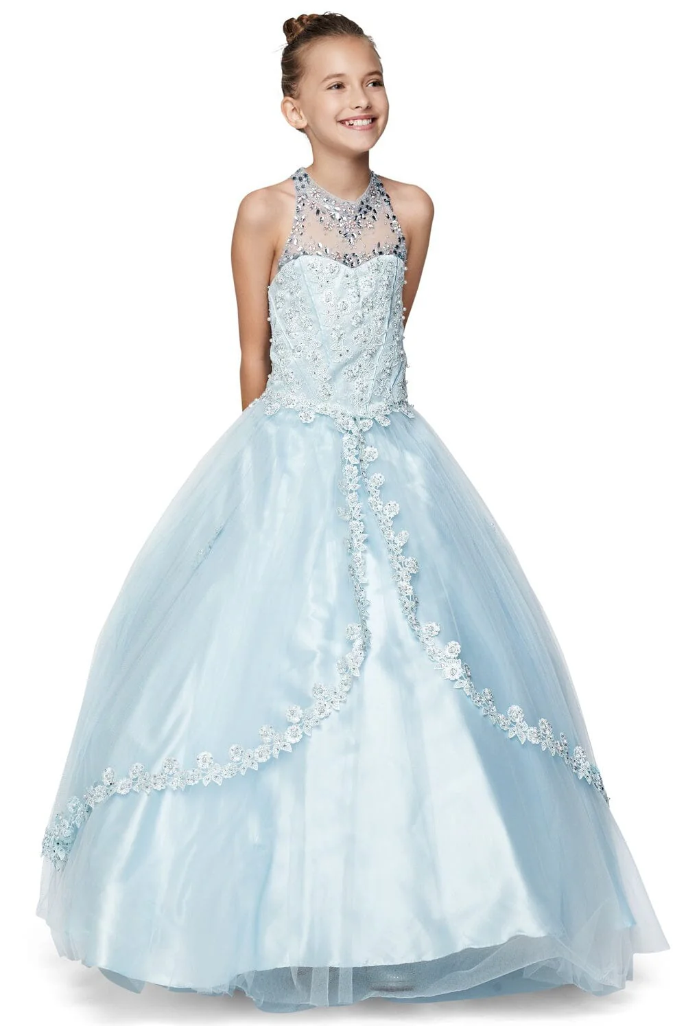 Your sweet girl will be the center of attention in this beaded sleeveless gown with ruffled skirt by Cinderella Couture 8002. Sweet elegant off shoulder with long sleeves, jewel beaded neckline with rhinestone beaded lace appliques bodice and skirt, layers of tulle soft A-line skirt with full hard net lining, and a lace up corset back.