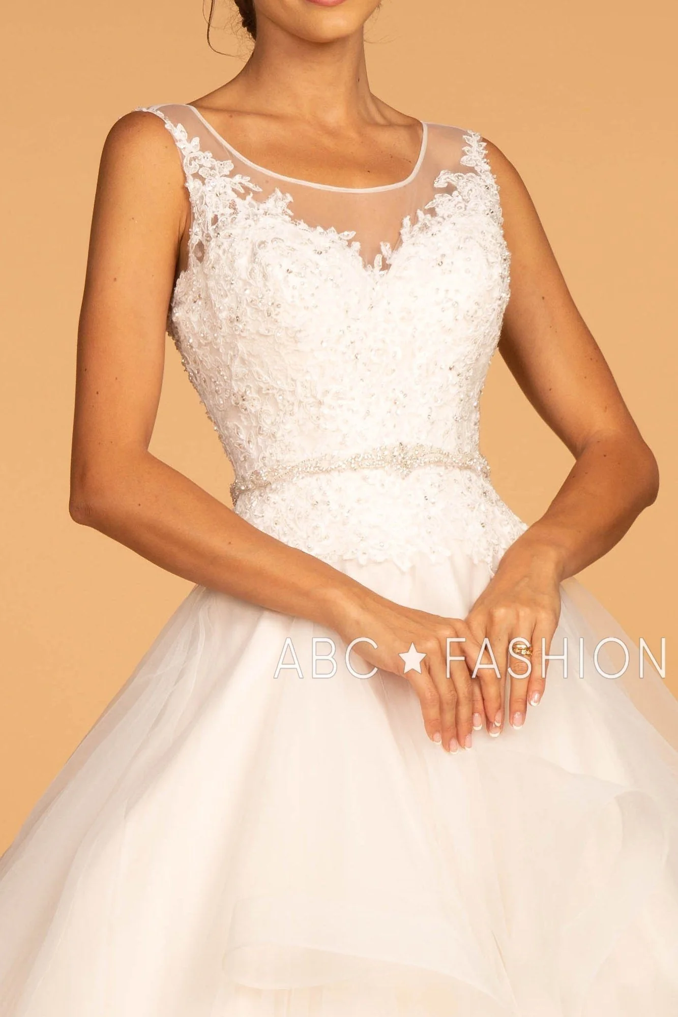 Take everyone's breath away in this long lace appliqued illusion sleeveless dress with layered skirt by Elizabeth K GL2599 during your wedding or for any formal event. This beautiful sleeveless gown features a sheer V-neckline adorned with elegant beaded lace appliques, a jeweled band around the waistline, embellished sheer back, the floor length skirt has gorgeous layered ruffles with horsehair hemline and is completed with a sweep train, and a cover button closure.