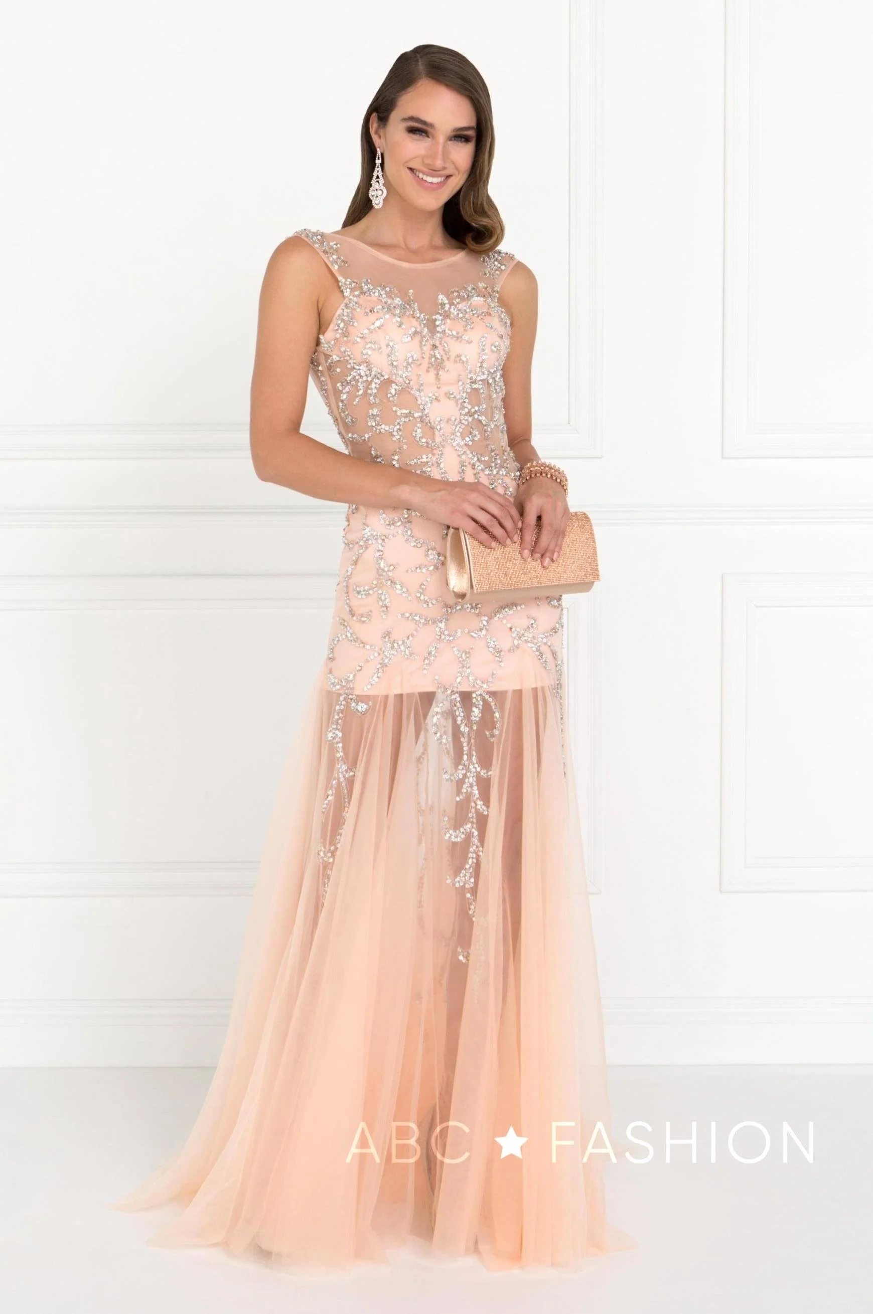 Look unforgettable in this beaded sheer gown by Elizabeth K GL2153. Sleeveless tulle full length dress with a crew neckline on a mermaid silhouette. Deep drop open back with zipper close. Beading and embroidery detail in a diamond sequence. Perfect for any formal event!
