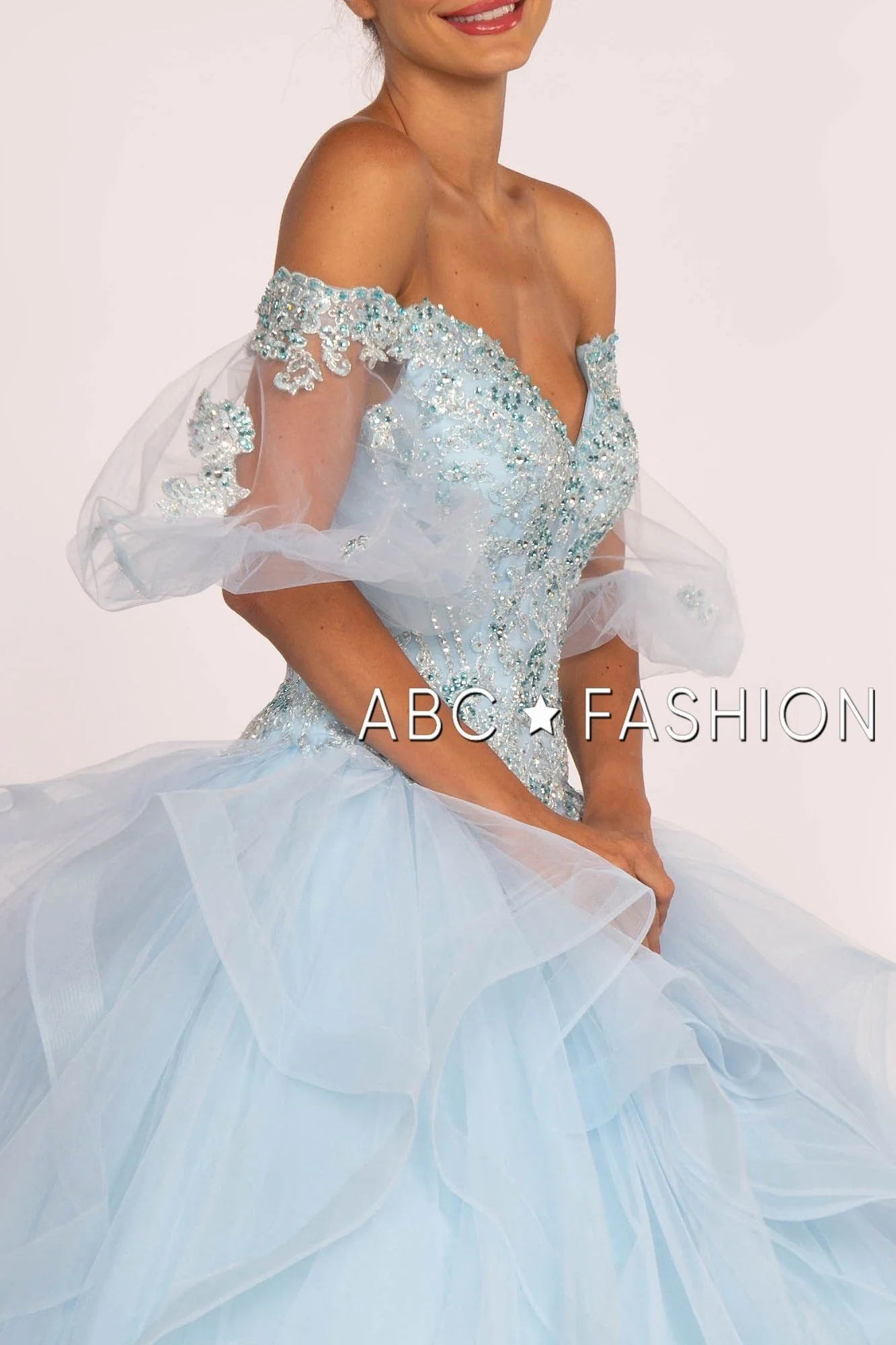 Be the center of attention in this long off the shoulder dress with layered skirt by Elizabeth K GL2601 during your Quinceanera party or for any formal event. This beautiful off shoulder gown features a sweetheart neckline adorned with dazzling beaded embellishments, sheer puff sleeves with beaded accents, a flirty open back, the floor length skirt has gorgeous layered ruffles with horsehair hemline and is completed with a sweep train, and a lace-up corset back.
