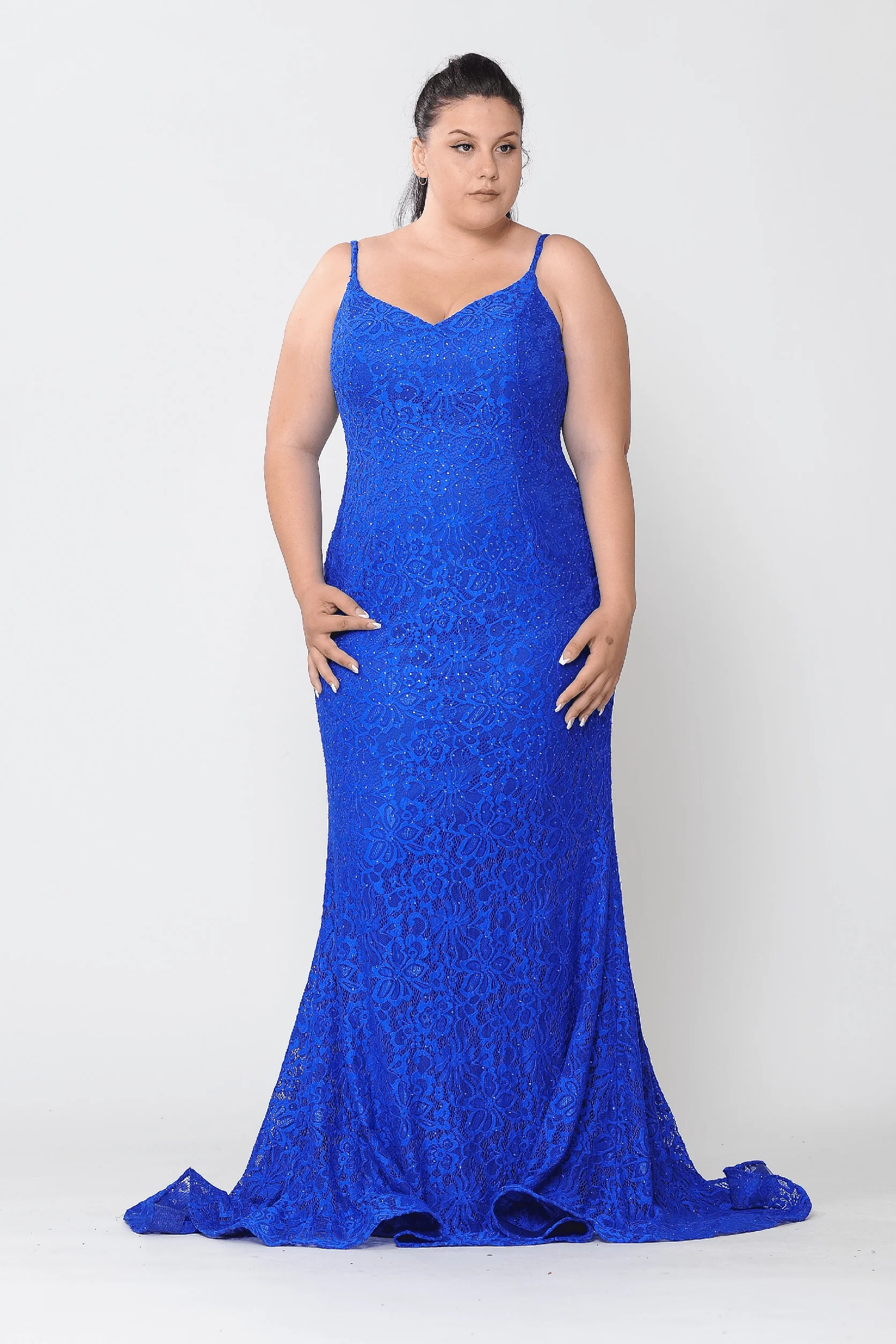Receive lots of compliments in this plus size long V-neck floral lace dress by Poly USA W1090. This beautiful gown features a sleeveless V-neck bodice, floral lace, open back, fitted floor length skirt with sweep train, and a lace-up corset back.