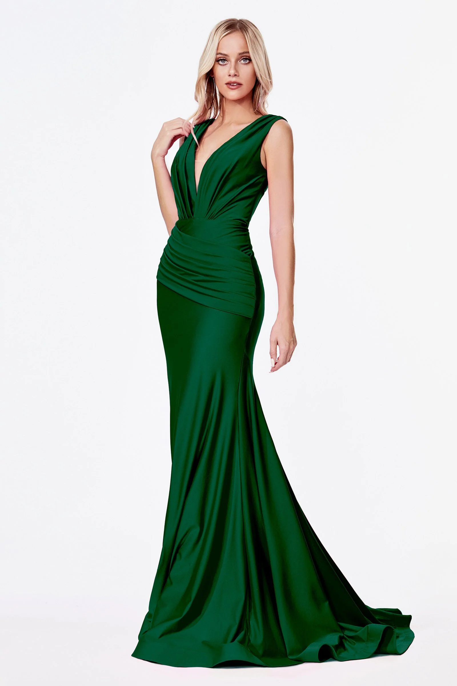 Look unforgettable in this ruched long jersey V-neck dress with open back by Cinderella Divine CD912.