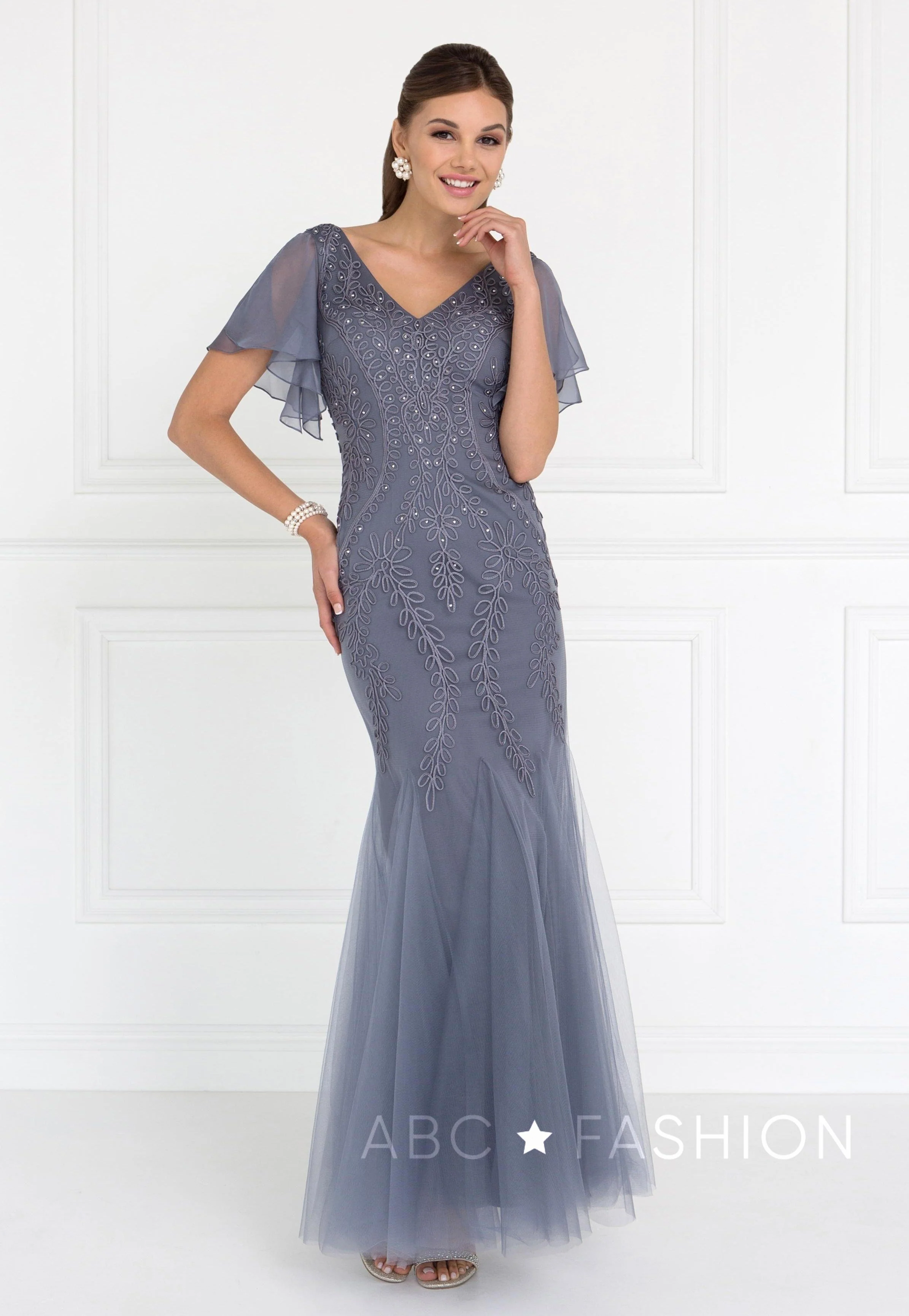 Make a statement in this embroidered short-sleeved mermaid dress by Elizabeth K GL1576. Short sleeve tulle full length dress with a V-neckline on a trumpet silhouette. Has a dip V-back with zipper close. Embroidery detail with soft jewel placement through out a solid one tone. Affordably priced under $200, this dress is perfect for any formal event and will keep you on budget!