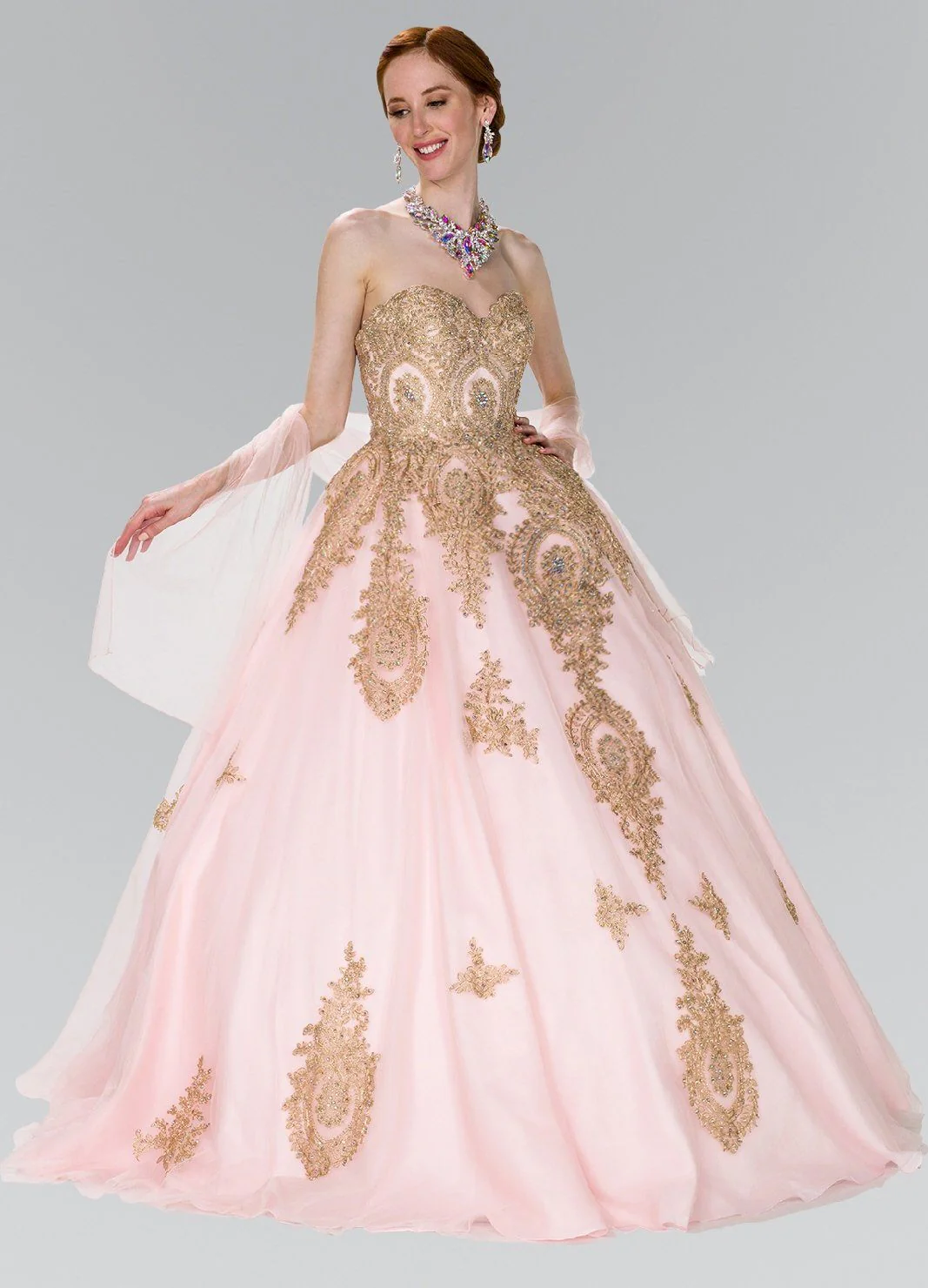 Light up the room in this strapless A-line dress with gold lace applique by Elizabeth K Style GL2379. This beautiful gown features a strapless sweetheart neckline, fully embellished with timeless gold lace applique, long A-line skirt, and a lace-up back.